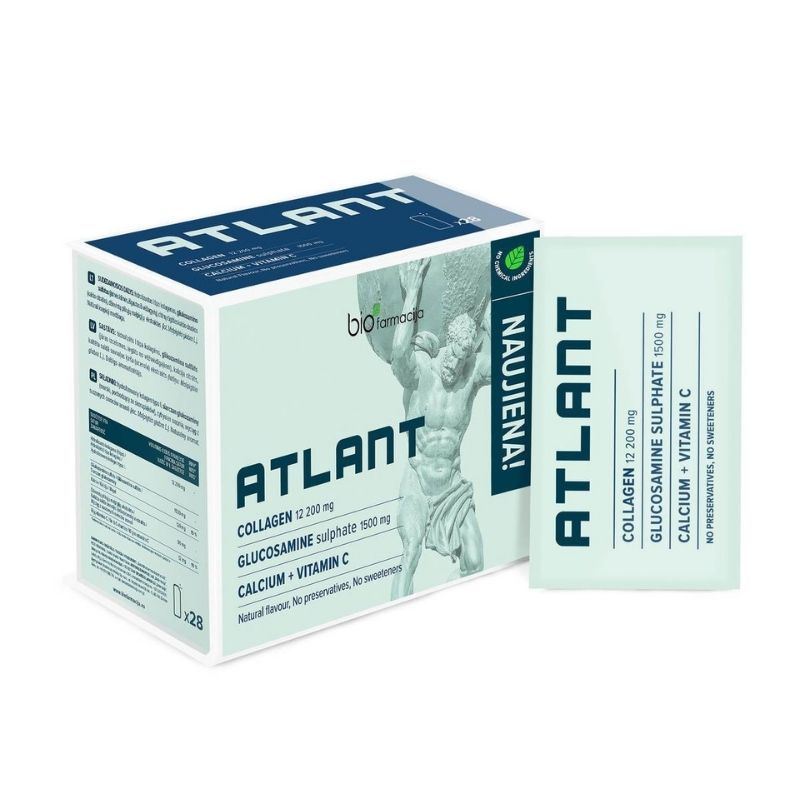 Kõrge kollageeni ja glükoosamiiniga BIOFARMACIJA Atlant toidulisand liigeste tervise toetuseks. Kollageeni ja glükoosamiini kompleks rikastatud kaltsiumi ja vitamiin C-ga. Kollageen on valk, mida inimorganism looduslikult toodab. See on naha üks olulisemaid elemente ja moodustab naha assist üle 70%, samuti kuulub kollageen liigeskõhre ja luude koostisesse. Glükoosamiinsulfaat on looduslikku päritolu (koorikloomadest). 1 pakk sisaldab 1500 mg glükoosamiini. Glükoosamiin on üks liigeskõhre põhikomponente. Vitamiin C aitab kaasa kollageeni normaalsele moodustumisele kõhrkoe normaalseks talitluseks. Kaltsium on vajalik normaalsete luude ja hammaste säilitamiseks. Karbis on 28 pakki.